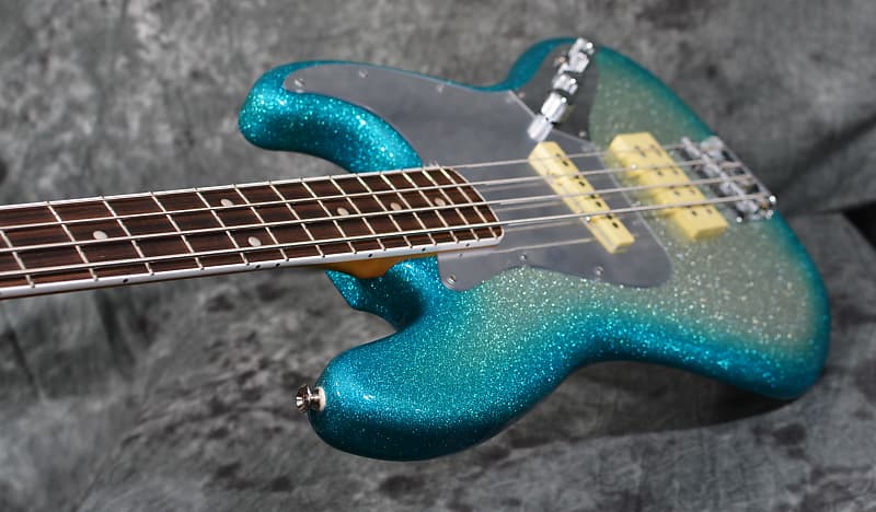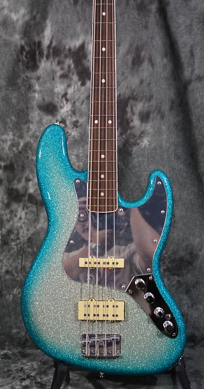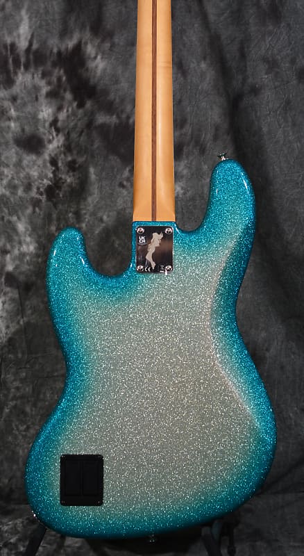From the dazzling Sky Burst Sparkle to the gleaming chrome hardware and mirrored pickguard, every detail on this Jazz Bass echoes Blu's bold artistic vision. The offset ash body is chambered to keep this bass as lightweight and comfortable as possible. The satin finished maple neck, bound 9.5” rosewood fingerboard and vintage tall frets provide smooth playability. The Custom Blu DeTiger Fireball® bass humbucker and Player Plus Noiseless™ Jazz Bass Pickups fuse vintage charm with modern punch. The bass also includes an 18V Player Plus preamp with 3-band EQ and active/passive toggle, great for sculpting your tone and ideal for capturing the funky snap and growl that defines Blu's sound.